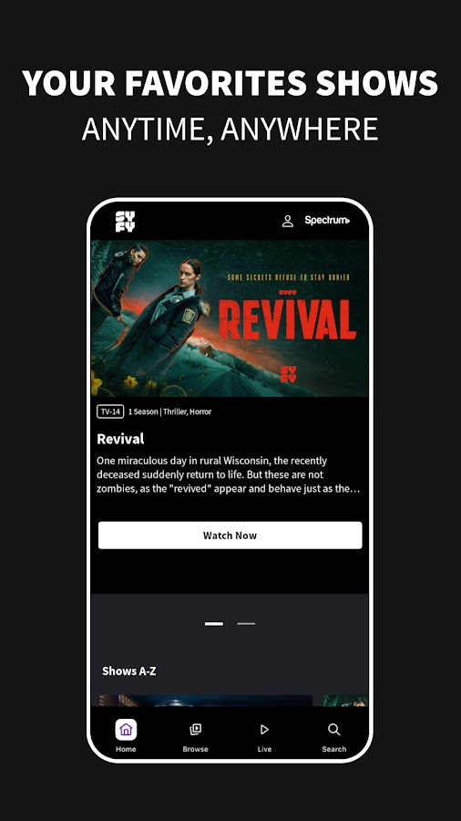o Приложение SYFY — лучшее место, чтобы посмотреть последние сезоны ваших любимых шоу, смотреть прямые трансляции и фильмы, а также контент прошлых сезонов,