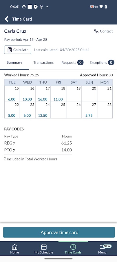 • Просматривайте предупреждения о пропущенных часах и предотвратимых сверхурочных часах, одобряйте часы, календари и карточки учета рабочего времени сотрудников, а также добавляйте, редактируйте или удаляйте часы и календари сотрудников.