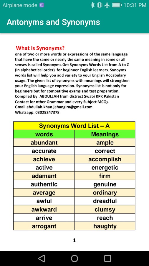 одно из двух или более слов или выражений одного и того же языка, которые имеют одинаковое или почти одинаковое значение в некоторых или всех смыслах, называется синонимами. Получите список слов-синонимов от А до Я (в алфавитном порядке) для начинающих изучающих английский язык. Список слов-синонимов поможет вам разнообразить использование вашей английской лексики. Данный список синонимов со значениями усилит ваше выражение английского языка. Список синонимов предназначен не только для новичков, но и для сдачи конкурсных экзаменов и подготовки к тестам.