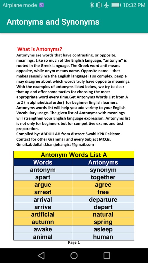 Антонимы — это слова, имеющие противоположные или противоположные значения. Как и большая часть английского языка, слово «антоним» имеет корни в греческом языке. Греческое слово анти означает противоположность, а антоним означает имя. Противоположное имя – это имеет смысл! Поскольку английский язык настолько сложен, люди могут расходиться во мнениях относительно того, какие слова действительно имеют противоположные значения. С помощью примеров антонимов, перечисленных ниже, мы пытаемся прояснить это и предложить некоторые тактики для выбора наиболее подходящего слова каждый раз. Получите список слов-антонимов от А до Я (в алфавитном порядке) для начинающих изучающих английский язык. Список слов-антонимов поможет вам разнообразить использование вашей английской лексики. Приведенный список антонимов со значениями улучшит ваше выражение английского языка. Список антонимов предназначен не только для начинающих, но и для конкурсных экзаменов и подготовки к тестам.