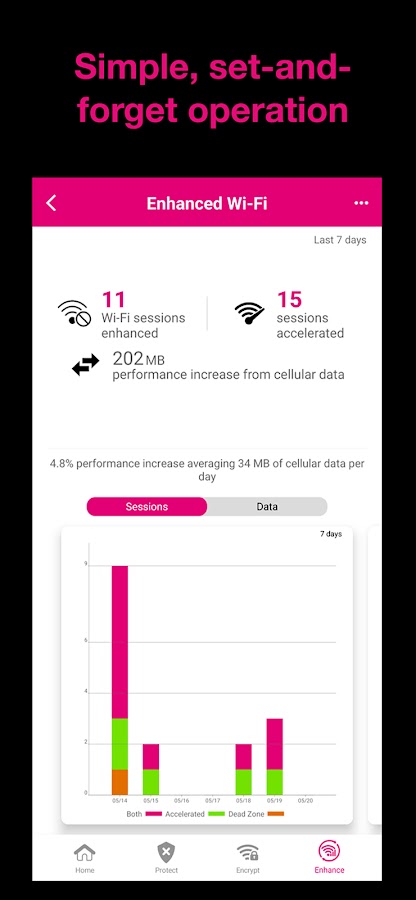 Улучшает подключение, подключаясь к крупнейшей и самой быстрой в Америке сети 5G с помощью запатентованной технологии объединения Wi-Fi, благодаря чему вам никогда не придётся отключать Wi-Fi.