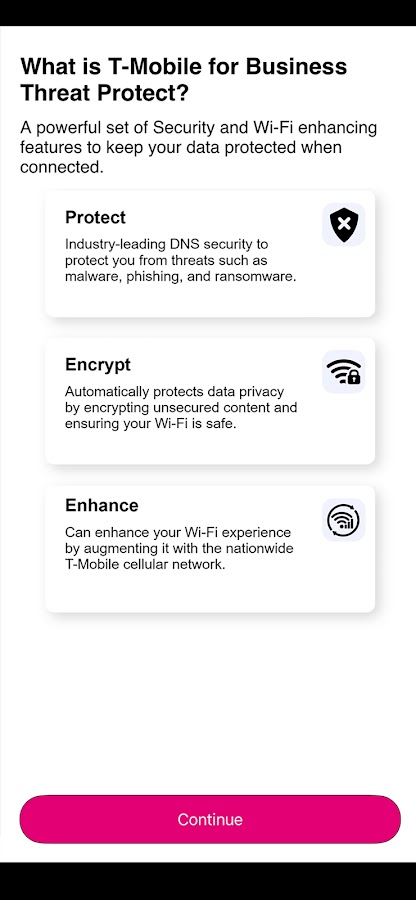 При включении Threat Protect использует технологию SmartVPN® для блокировки угроз во всех сетях и приложениях, а не только в браузере. Защита обеспечивается непрерывно: от вредоносных ссылок в фишинговых письмах, SMS-сообщений и социальных приложений. Три функции безопасности корпоративного уровня от T-Mobile гарантируют вам максимальную защиту и постоянное подключение: