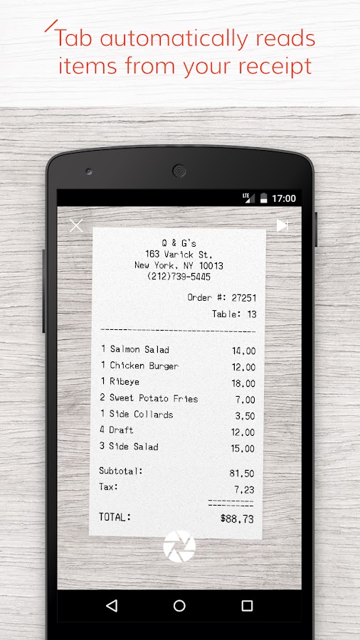 Tab является простой способ разделить счет среди друзей. Привязать рис чека и нажмите ваши детали, чтобы требовать их. Налоги и чаевые рассчитываются для вас. Нет больше бэк-оф-салфетку алгебры или набрав цен вручную!