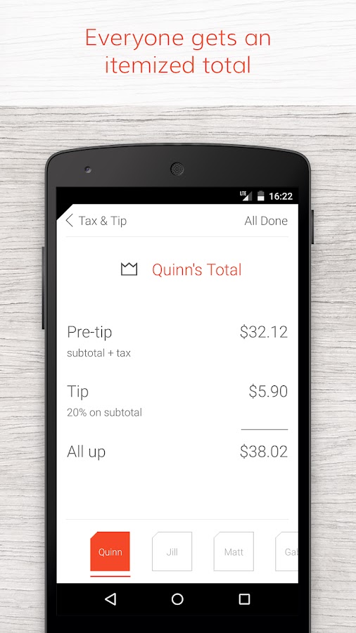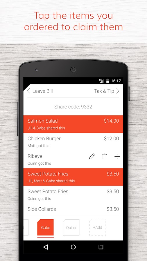 • Выберите, какие элементы каждый человек заказал. Все с Tab на свой телефон можно присоединиться на счет и выберите свои собственные элементы — Tab сохраняет все синхронизированные в реальном времени.