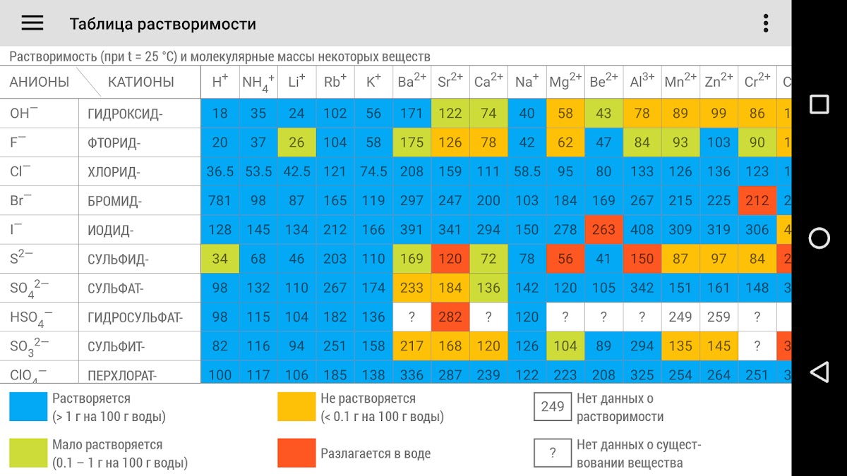3. Таблица растворимости солей, кислот и оснований, которая также незаменима при изучении химии, особенно в школе. Растворимость — способность вещества образовывать с другими веществами однородные системы — растворы, в которых вещество находится в виде отдельных атомов, ионов, молекул или частиц. Таблицу растворимости используют для проверки условий протекания реакции. Так как одним из условий протекания реакции является образование осадка (необратимость протекания реакции), то по таблице растворимости можно проверить образование осадка и тем самым определить, протекает реакция или нет.