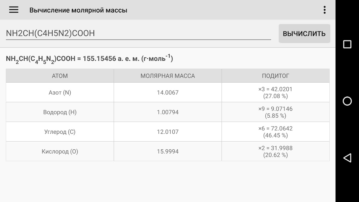 4. Молярный калькулятор, который поможет в вычислении молярной массы химического соединения, состоящего из набора химических элементов.