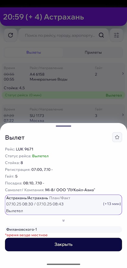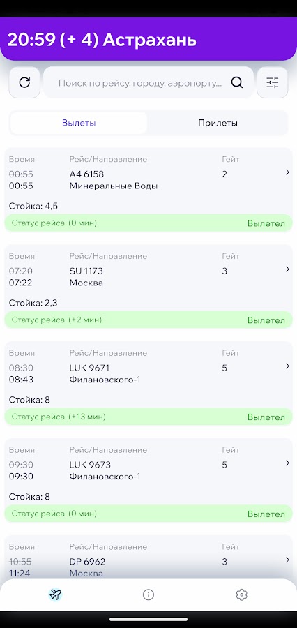 — онлайн данные по рейсам: время вылета или прилета, отклонения от расписания с сайта airportastrakhan.ru