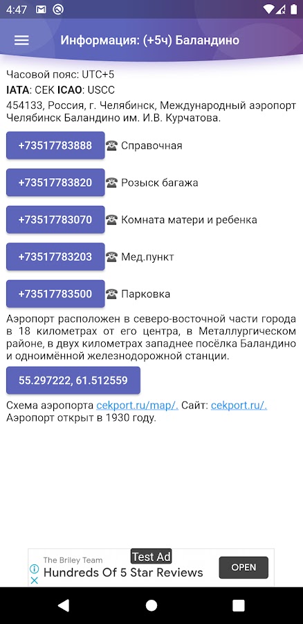 Неофициальное приложение аэропорта Баландино (Челябинск), предоставляющее информацию о статусах рейсов (вылет/прилет). Расписание, контактная и прочая информация. Есть возможность развернуть строку табло в экран расширенных данных.