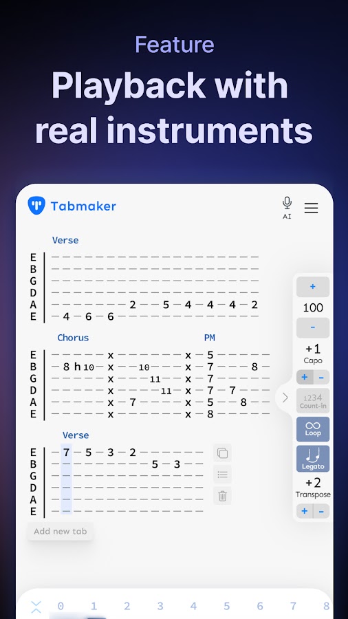 Создавайте табулатуры для гитары, баса, банджо или укулеле, играйте их, экспортируйте в PDF, TEXT или распечатывайте прямо с телефона. Вы также можете играть по созданным табулатурам, используя встроенные инструменты, такие как электрогитара, акустическая гитара и многое другое!