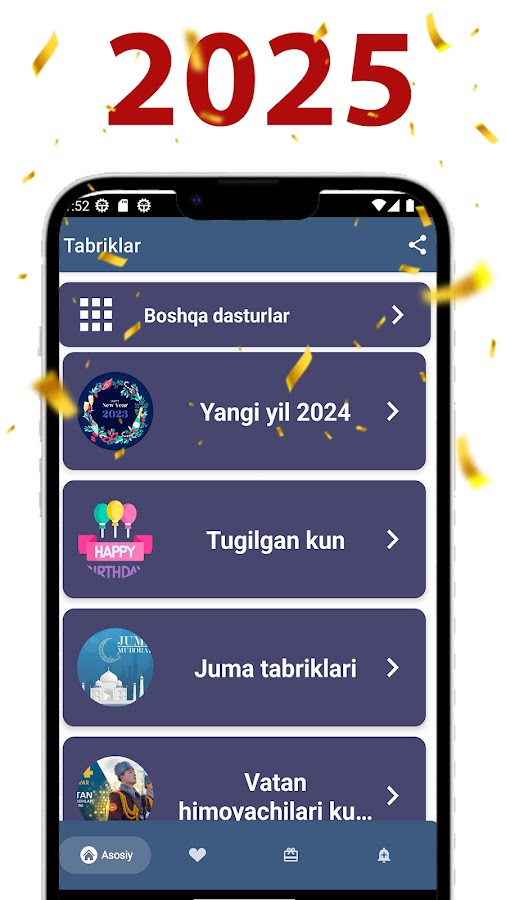 Скачайте приложение Tabriklar — Yangi yil 2025 для Android бесплатно - последняя версия (1.2.0) уже доступна для установки на ваш телефон или планшет.
