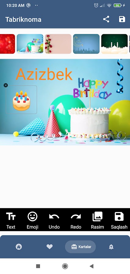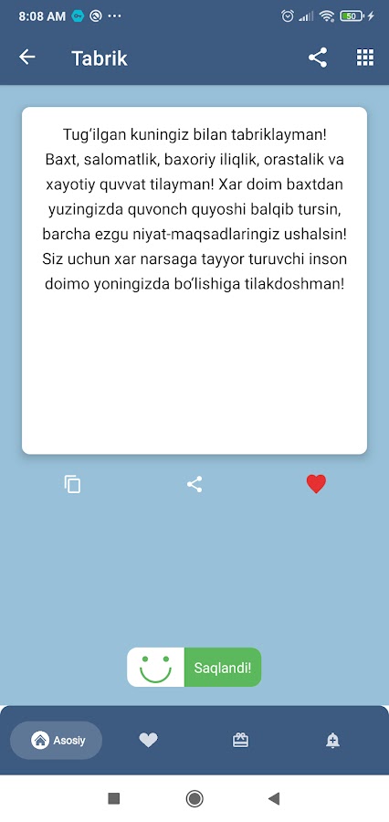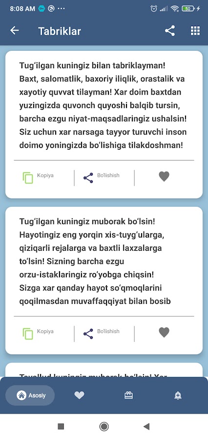 Har xil bayramlar bilan tabriklash bizning dasturimiz bilan juda osson. Kerakli tabrik yoki sherni tanlang va o’z yaqin insonlaringizga telegram, sms va boshqa ijtimoiy tarmoqlar orqali jo’nating. Ushbu ilovada: