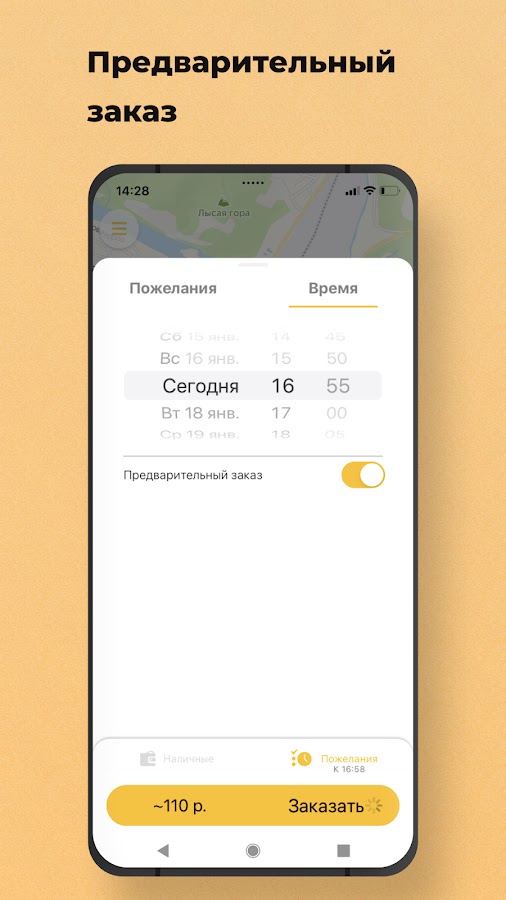 Выберите опцию “Предварительный заказ”. Поиск автомобиля начнется незадолго до заказа поездки, и автомобиль приедет к назначенному времени. Также вы будете заранее знать стоимость поездки.
