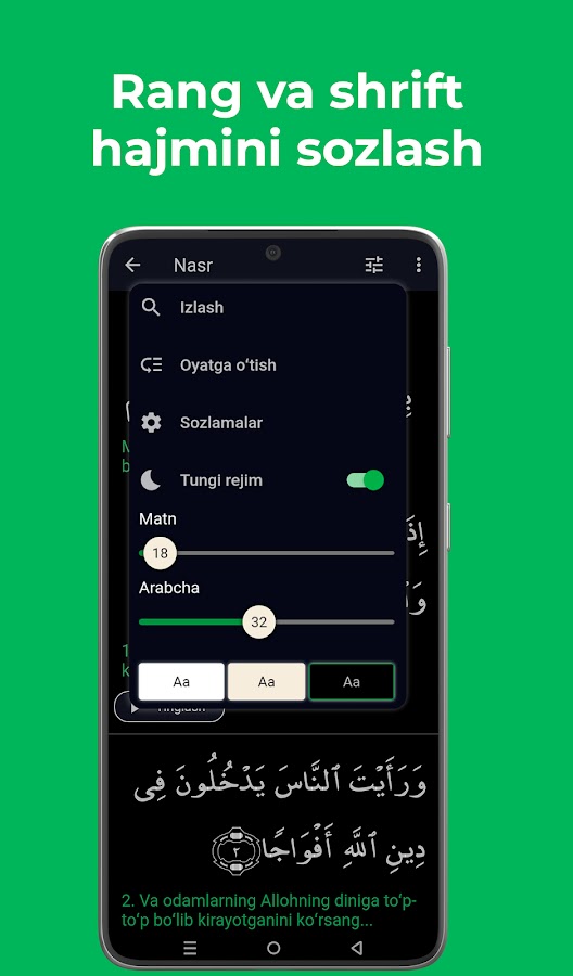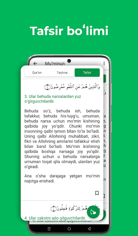 Илова орқали Қуръони Каримдаги 114 суранинг арабий матни, маъно таржимаси ва тафсирини ўқишингиз мумкин: