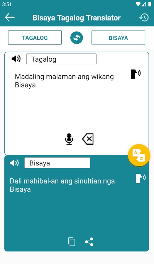 * Это приложение для перевода абсолютно бесплатно. Вы можете переводить слова и предложения обоими способами: с тагальского на тагальский и с тагальского на бисайя. Это полезное приложение для перевода предлагает быстрые и точные переводы.