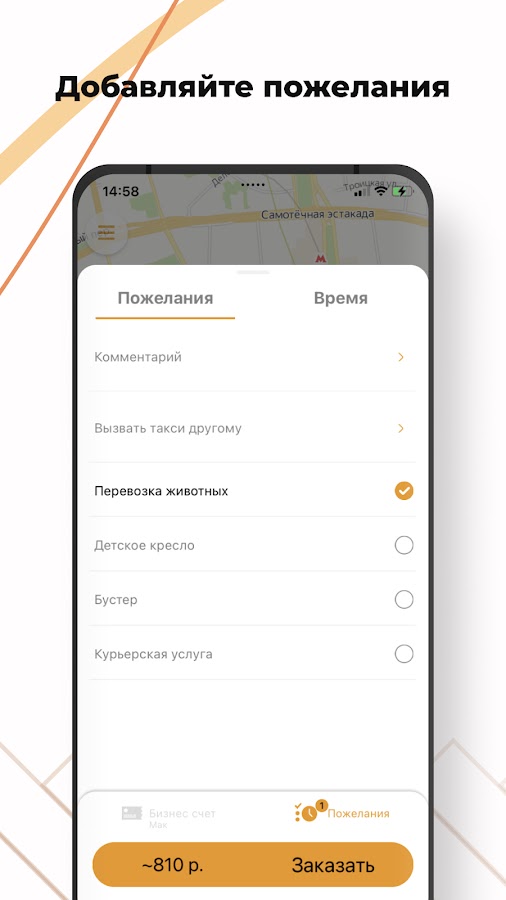 Добавьте к заказу дополнительные пожелания. Например, когда едете с ребенком — выберите «детское кресло». Если надо перевезти питомца — укажите «Перевозка животных».