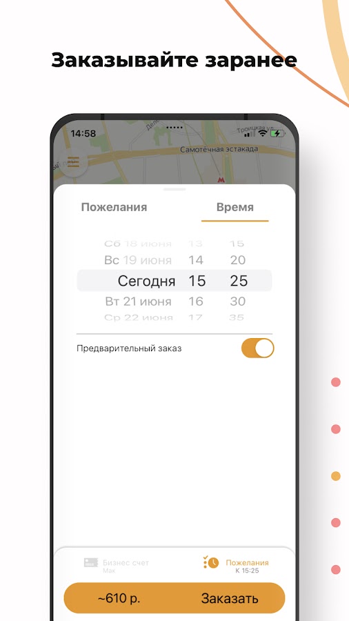 Выберите опцию “Предварительный заказ”. Поиск автомобиля начнется незадолго до заказа поездки, и автомобиль приедет к назначенному времени. Также вы будете заранее знать стоимость поездки.