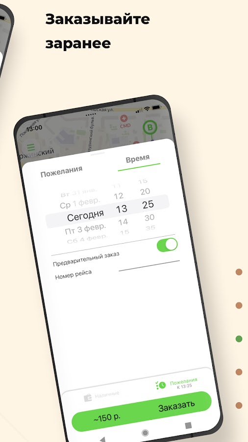 Нужен автомобиль к определенным времени и дате? Закажите его заранее через приложение, и в назначенное время такси будет ждать вас у подъезда.