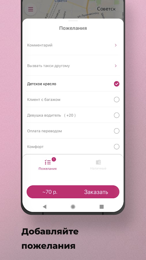 Добавьте к заказу дополнительные пожелания. Например, если едете с ребенком — выберите «детское кресло». Если у вас 2 чемодана и сумки в придачу — укажите «Клиент с багажом». Или выберите “Оплата переводом”, если нет с собой наличных.