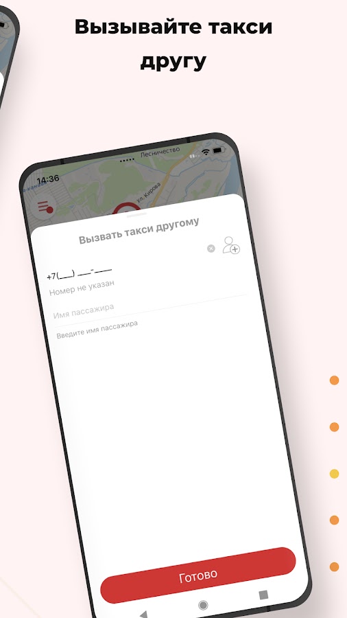 Используйте опцию “Вызвать такси другому” в разделе “Пожелания” и укажите его номер телефона. Когда такси подъедет, на указанный номер придет СМС, а вам — сообщение в приложении.