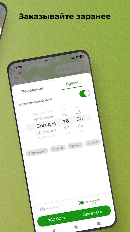 Нужен автомобиль к определенным времени и дате? Закажите его заранее через приложение, и в назначенное время такси будет ждать вас у подъезда.