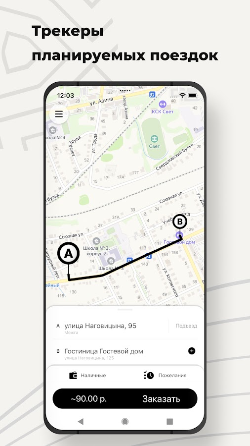 Выберите опцию “Предварительный заказ”. Поиск автомобиля начнется незадолго до заказа поездки, и автомобиль приедет к назначенному времени. Также вы будете заранее знать стоимость поездки.