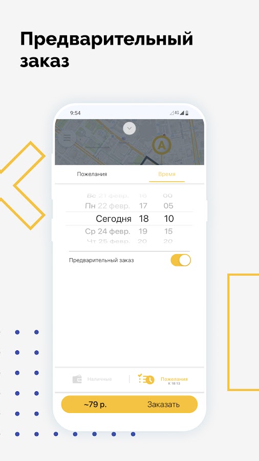 Выберите опцию “Предварительный заказ”. Поиск автомобиля начнется незадолго до заказа поездки, и автомобиль приедет к назначенному времени. Также вы будете заранее знать стоимость поездки.