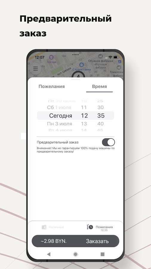 Выберите опцию “Предварительный заказ”. Поиск автомобиля начнется незадолго до заказа поездки, и автомобиль приедет к назначенному времени. Также вы будете заранее знать стоимость поездки.