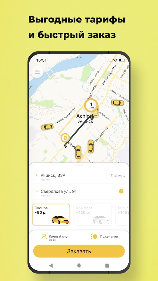 Откройте приложение, укажите адрес и закажите такси, нажав на одну кнопку.