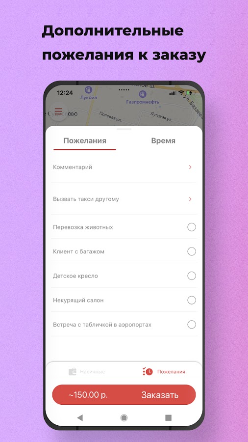 📱 Следите за поездкой на карте. Приложение сообщит время подачи, марку, цвет, номер машины, а также имя водителя.