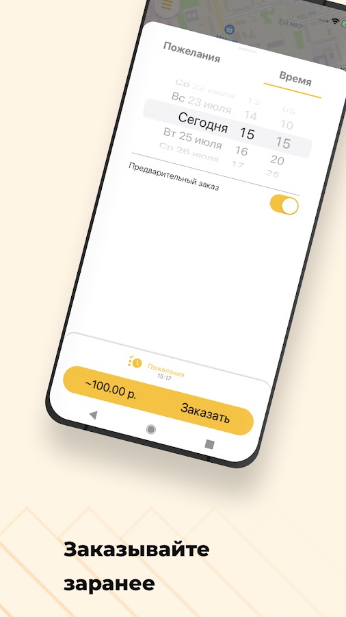 Выберите опцию “Предварительный заказ”. Поиск автомобиля начнется незадолго до заказа поездки, и автомобиль приедет к назначенному времени. Также вы будете заранее знать стоимость поездки.