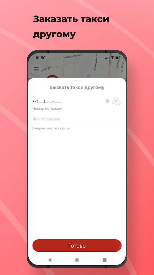 Используйте опцию “Вызвать такси другому” в разделе “Пожелания” и укажите его номер телефона. Когда такси подъедет, на указанный номер придет СМС, а вам — сообщение в приложении.