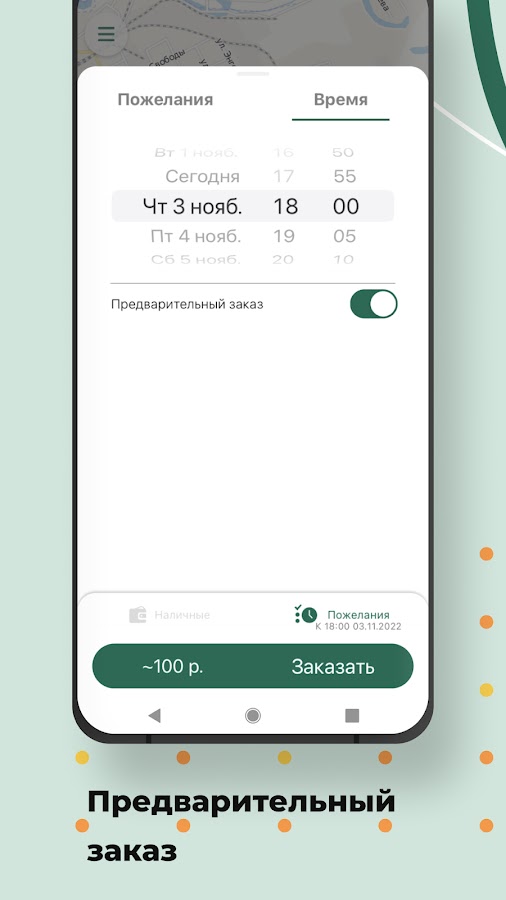 Выберите опцию “Предварительный заказ”. Поиск автомобиля начнется незадолго до заказа поездки, и автомобиль приедет к назначенному времени. Также вы будете заранее знать стоимость поездки.