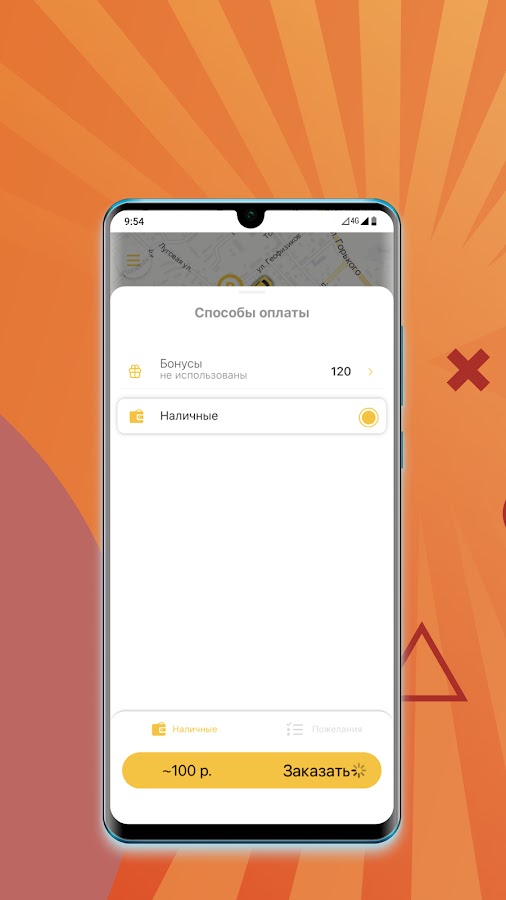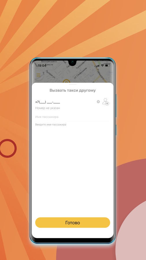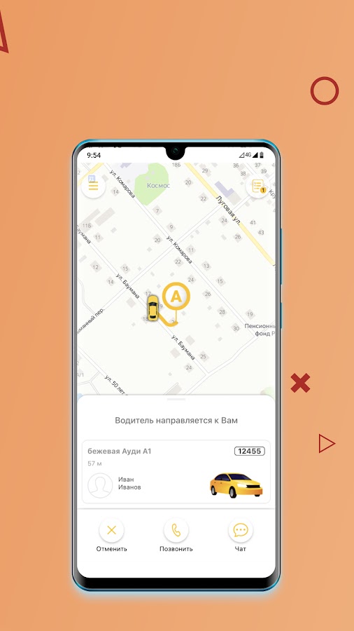 Следите за поездкой на карте. Приложение сообщит время подачи, марку, цвет, номер машины, а также имя водителя.