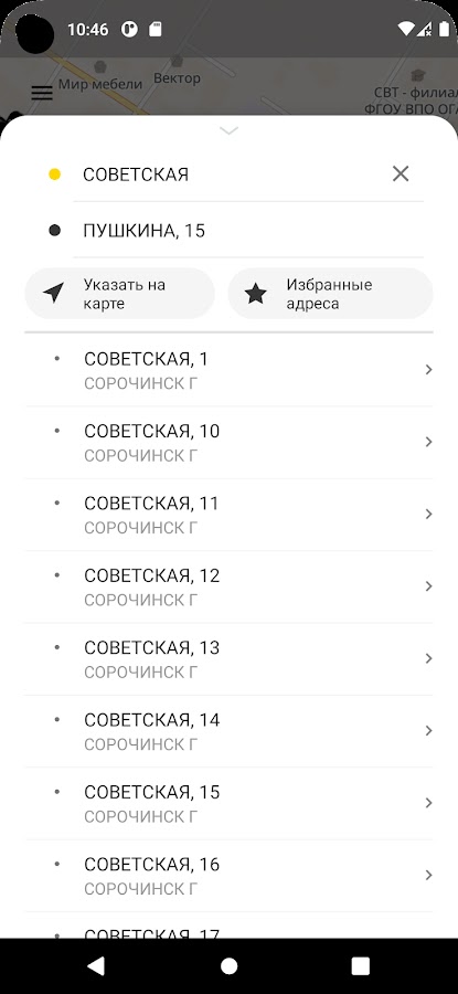 * Выбирать адрес на карте, вводить его вручную или выбирать из списка ранее использованных адресов