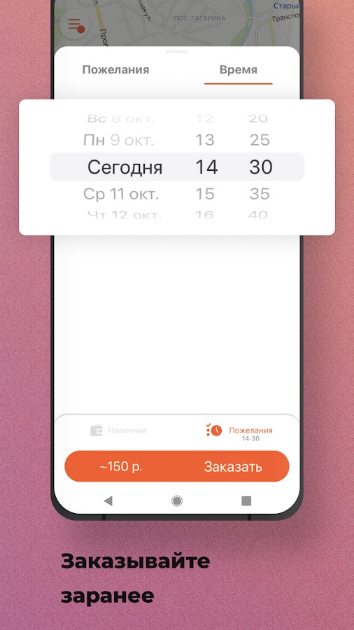 Выберите опцию “Предварительный заказ”. Поиск автомобиля начнется незадолго до заказа поездки, и автомобиль приедет к назначенному времени. Также вы будете заранее знать стоимость поездки.