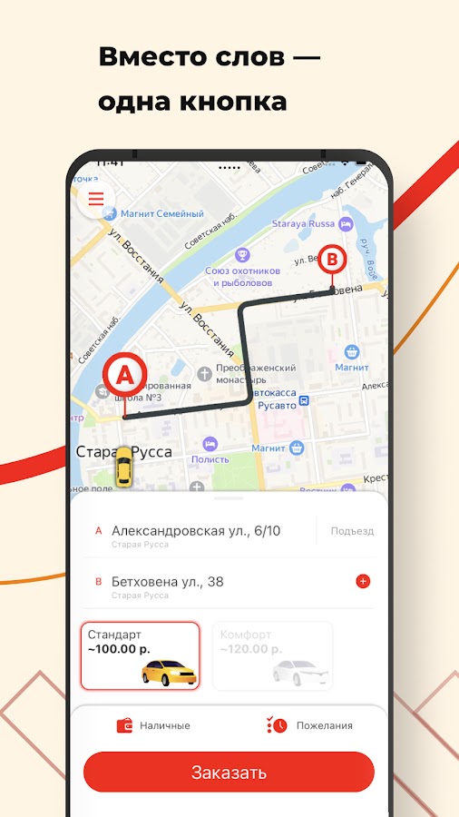 Закажите такси Сити Плюс в городе Старая Русса через приложение. Это в 3 раза быстрее, чем по телефону! Между желанием доехать до нужного места и поиском автомобиля — пара секунд.