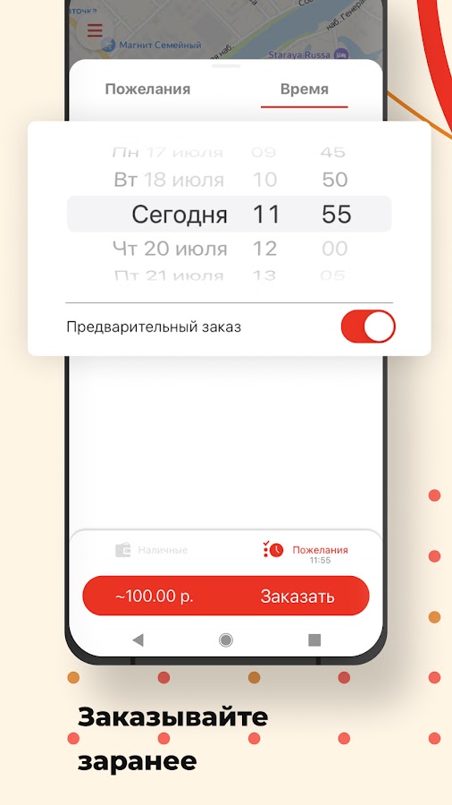 Выберите опцию “Предварительный заказ”. Поиск автомобиля начнется незадолго до заказа поездки, и автомобиль приедет к назначенному времени. Также вы будете заранее знать стоимость поездки.