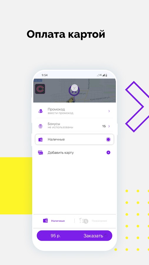 Оплачивайте поездку наличными или банковской картой. Делитесь вашим личным реферальным кодом с друзьями в социальных сетях и в магазинах приложений, получайте бонусы и используйте их для выгодных поездок.