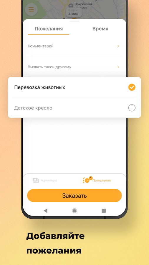 Используйте опцию “Вызвать такси другому” в разделе “Пожелания” и укажите его номер телефона. Когда такси подъедет, на указанный номер поступит звонок, а вам — сообщение в приложении.