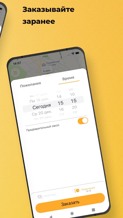 Выберите опцию “Предварительный заказ”. Поиск автомобиля начнется незадолго до заказа поездки, и автомобиль приедет к назначенному времени. Также вы будете заранее знать стоимость поездки.