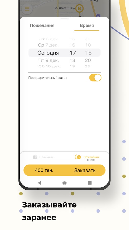 Нужен автомобиль к определенным времени и дате? Закажите его заранее через приложение, и в назначенное время такси будет ждать вас у подъезда.