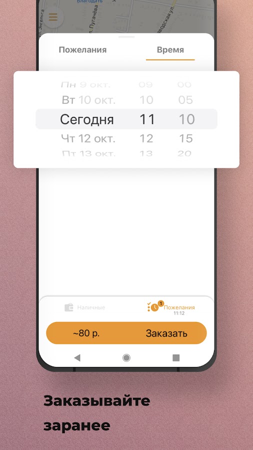 Выберите опцию “Предварительный заказ”. Поиск автомобиля начнется незадолго до заказа поездки, и автомобиль приедет к назначенному времени. Также вы будете заранее знать стоимость поездки.