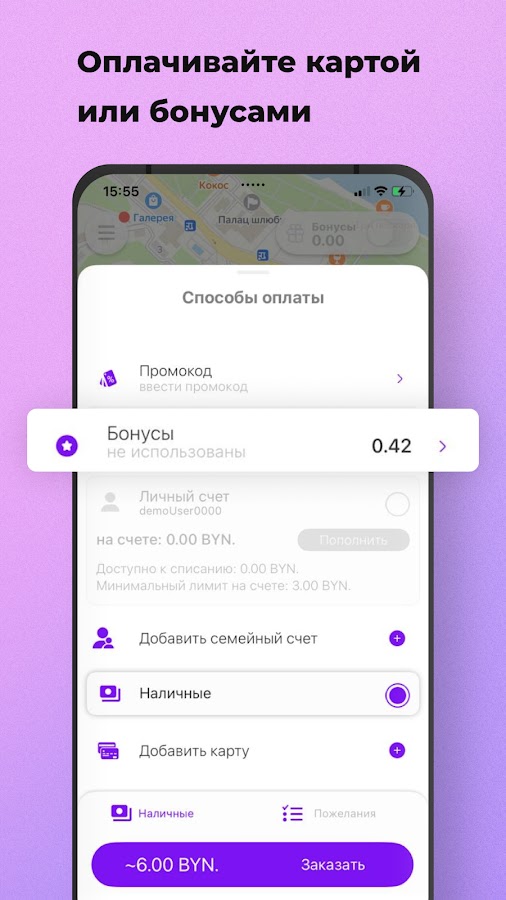 Оплачивайте поездки наличными, картой или накопленными бонусами. Также вы можете оплатить поездку через любое банковское приложение по QR-коду.