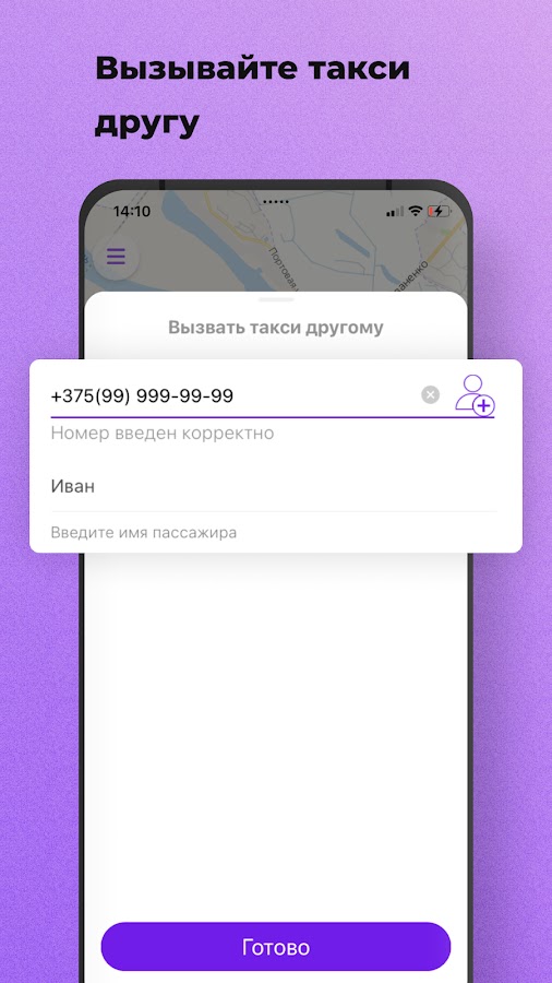 Используйте опцию “Вызвать такси другому” в разделе “Пожелания” и укажите его номер телефона. Когда такси подъедет, на указанный номер придет СМС, а вам — сообщение в приложении. Также вы можете поделиться информацией о своем заказе, просто скинув ссылку. Близкие люди будут точно знать где вы и с кем.
