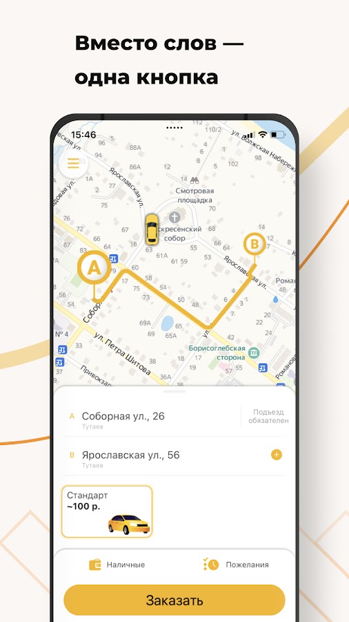 Откройте приложение, укажите адрес и закажите такси, нажав на одну кнопку.