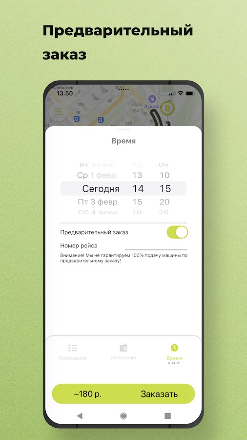 Выберите опцию “Предварительный заказ”. Поиск автомобиля начнется незадолго до заказа поездки, и автомобиль приедет к назначенному времени. Также вы будете заранее знать стоимость поездки.