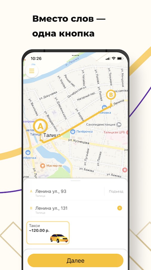 📱 Следите за поездкой на карте. Приложение сообщит время подачи, марку, цвет, номер машины, а также имя водителя.