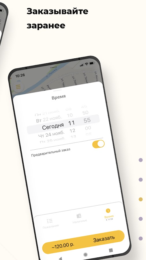 🕑 Вызывайте такси к определенному времени, если нужно запланировать поездку заранее. Например, поездка в аэропорт, чтобы успеть на регистрацию.