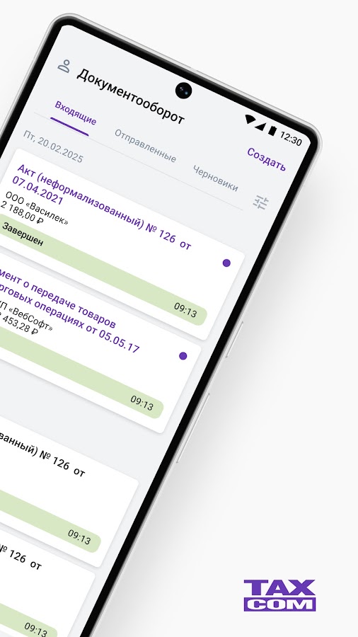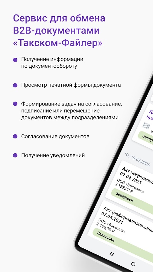 Такском-Файлер – сервис для обмена В2В-документами в электронном виде с помощью мобильных устройств. Приложение позволяет пользователю оперативно просматривать, согласовывать и отправлять на согласование документы, получать информацию о состоянии документооборота с контрагентами.