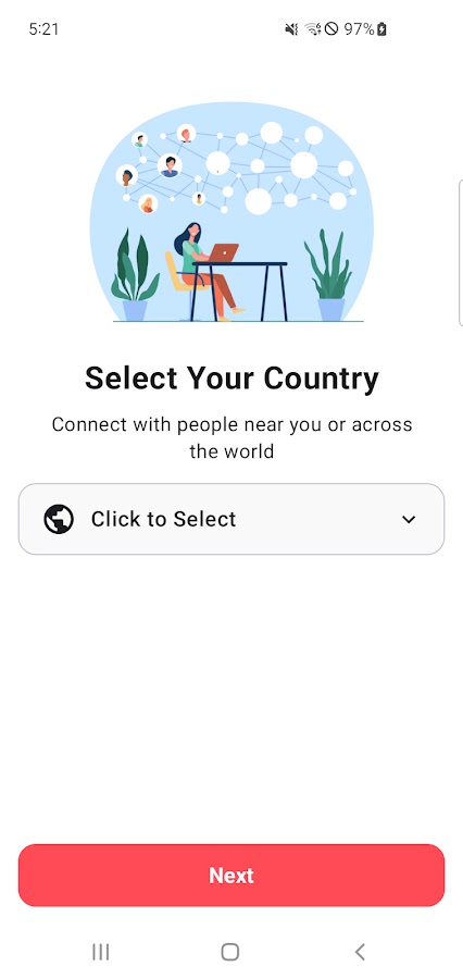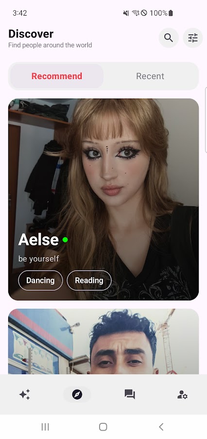 Просматривайте профили со всего мира в ленте «Открытия». Фильтруйте по тегам интересов, стране и статусу онлайн в режиме реального времени. Переключайтесь между вкладками «Рекомендованные» и «Недавние», чтобы найти кого-то нового.